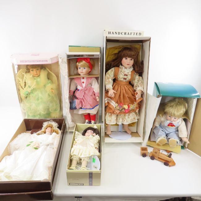 6 Vintage Porcelain Collector Dolls in Boxes - Goebel, Moments Treasured, Collectible Memories & Beautiful Expression. All have been displayed, some boxes were in storage and have wear. Please read terms & conditions and ask questions before bidding.