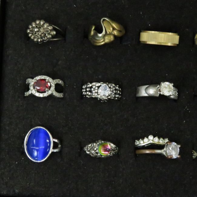 72 Fashion Rings - some gold and silver plated, tray not included Please ask questions & read terms and conditions before bidding.