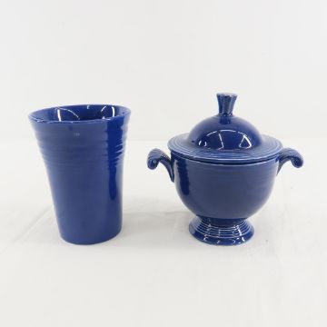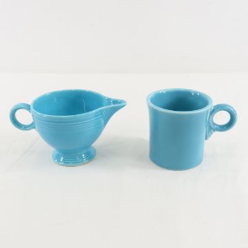 Assorted Fiesta Dining Pieces - yellow gravy and teacup with saucer, cobalt cup and creamer with lid, rose salt shaker & creamer, turquoise creamer & mug Please ask questions & read terms and conditions before bidding.