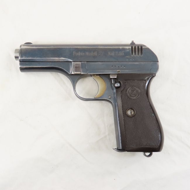 CZ Model 27 7.65 (.32ACP) with holster & extra mag-4" barrel, fixed sights, German eagle marked Frame, barrel & Slide, Böhmische Waffenfabrik (under German occupation), no import mark, checkered CA plastic grips (damage on left side), 2 9 round magazines marked P Mod 27,Serial # 75877, with cut down leather holster, C&R or FFL transfer required, please know local laws before bidding. Please read terms & conditions and ask questions before bidding.