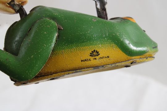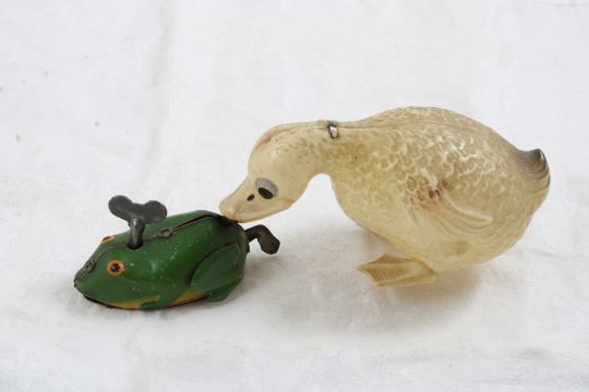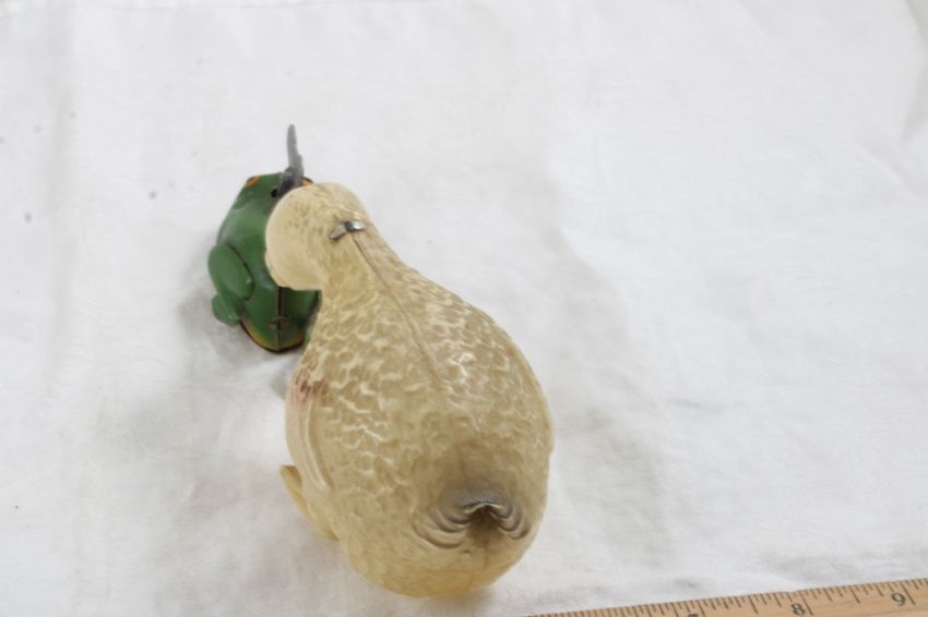 Japan Celluloid Duck Chasing Frog Wind Up Toy - Working Condition. As pictured. Please ask questions and rerad terms & conditions before bidding.