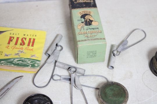 Fishing Items Stringer, Lines, Guide Book, Knife - Vintage Weighted Treble Fishing Hooks (Over 6 Pounds). As pictured. Please ask questions and rerad terms & conditions before bidding.