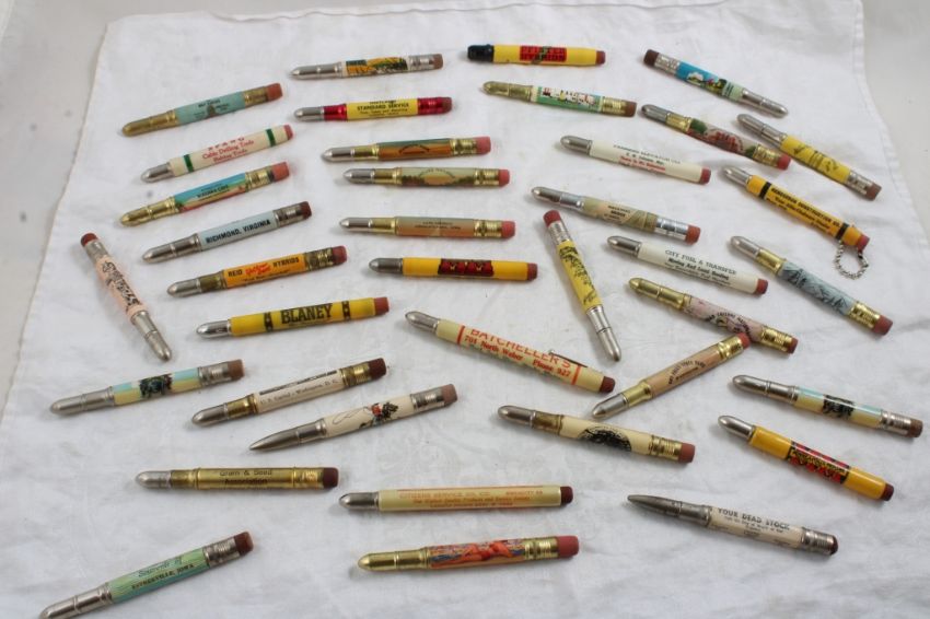 38 Advertising Bullet Pencils -Minneapolis Moline - Bily Clocks, Alaska Totem, Pfister, Allis Chalmers, Incline Railway, Plymouth Rock, Standard Oil, Bathing Beauty and More. All as pictured Please ask questions and rerad terms & conditions before bidding.