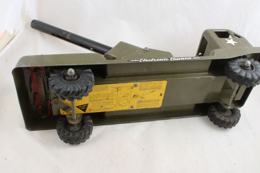 Nylint 1950's Electronic Cannon Launcher Toy - Pressed Steel and measures 20" Long and 7" Tall. Some parts are missing as pictured. Please ask questions and rerad terms & conditions before bidding.