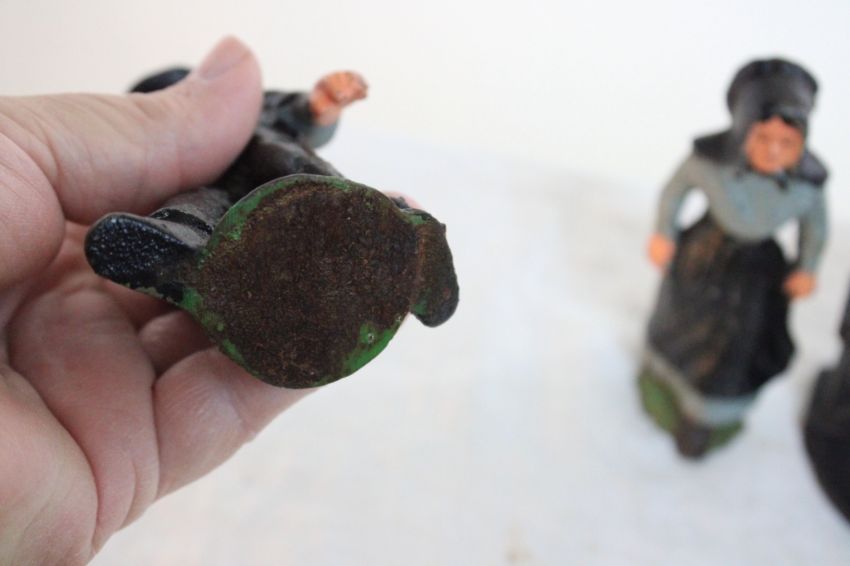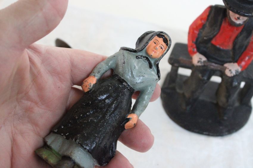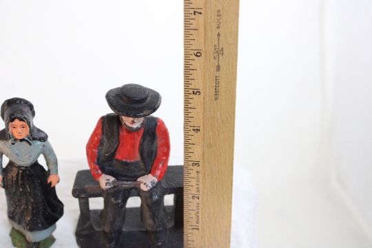 5 Cast Iron Amish Figures - Man on Bench 5" Tall, Man & Woman each 5" Tall and Boy and Girl Salt & Pepper shakers 2 1/2" Tall. All as pictured. Please ask questions and read terms & conditions before bidding.