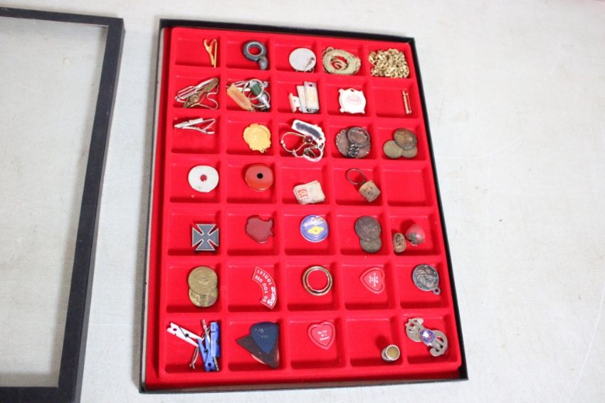 Riker Box with Small Collectibles - Box measures 16 1/4" x 12 1/4". All as pictured. Please ask questions and rerad terms & conditions before bidding.