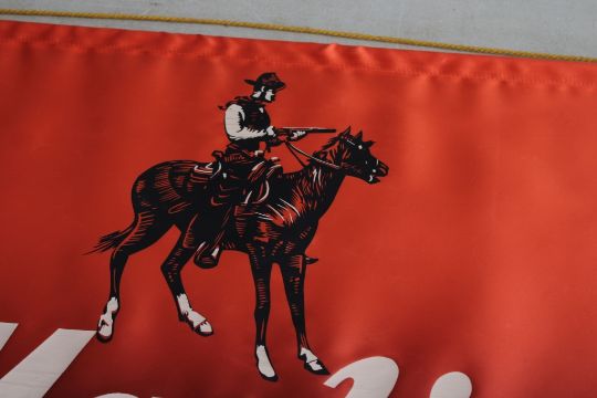 Target Store Display Sign Marlin Rifles & Shotguns - Target Store Banner/Sign Advertising Marlin Rifles & Shotguns that measures as follows: Banner 28" x 20" and wooden bar that the banner hangs from measures 34 1/2" from tip to tip. MADE BY HOLLYWOOD BANNERS OF N.Y.C.As pictured. Please ask questions and rerad terms & conditions before bidding.