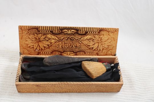 Flemish Pyrography Glove Box with Gloves, Broom - Small Whisk Broom (Antique). Glove Box has several pair of gloves. All as pictured. Please ask questions and rerad terms & conditions before bidding.