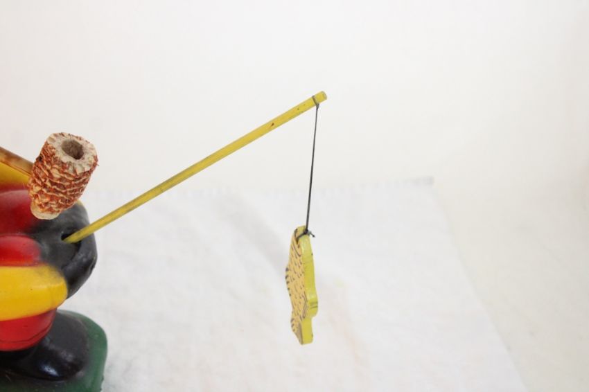 Black Americana Chalkware Fishing Boy w/Pipe - Boy has a corn cob pipe that is broken that should be in his mouth. He measures 12" Tall as pictured. Please ask questions and rerad terms & conditions before bidding.
