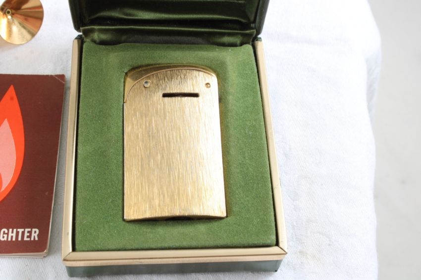 Evans Gold Butane Lighter, JJJ Lighter, 2 Funnels - Eans Gold Butane Lighter in Box JJJ Ladies Gold Plated Butane Lighter and 2 Metal Lighter fluid funnels. All as pictured. Please ask questions and rerad terms & conditions before bidding.