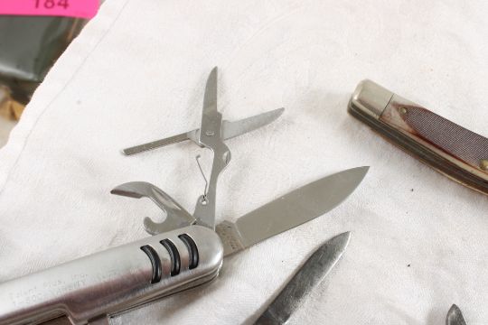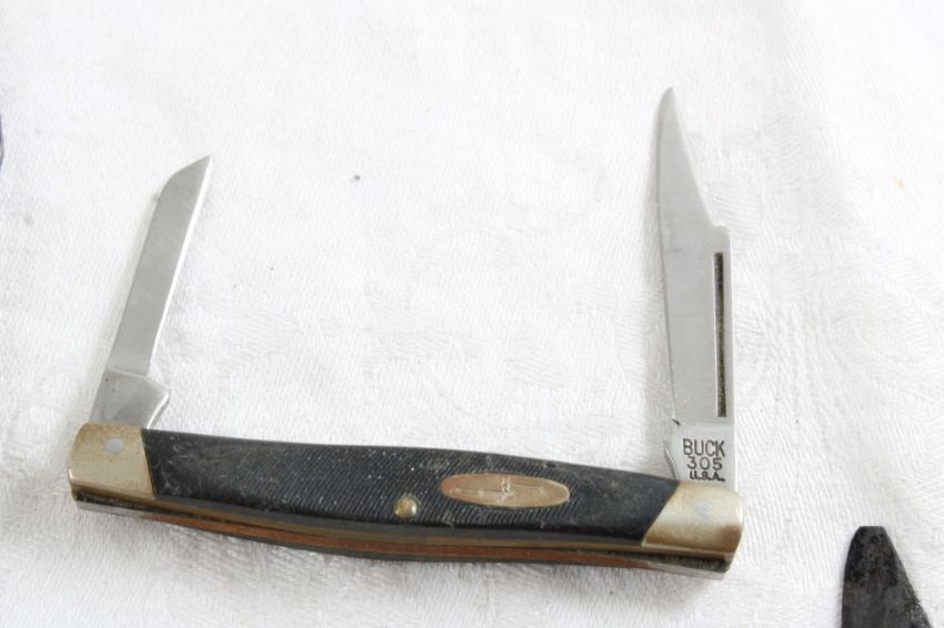5 Pocket Knives - Ulster 3 Blade Knife, Schrade 2 Blade Knife, Buck #305 2 Blade Knife, Imperial Knife and unmarked Advertising pocket knife. All as pictured. Please ask questions and rerad terms & conditions before bidding.