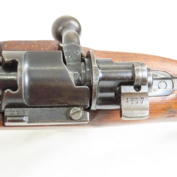 1938 Borsigwalde 243 Mauser K98k Rifle 7.92x57mm - SN# 4517m"- all visible are matching, no import marks, overall good, Waffenamt. Receiver top marked "243 1938", left "eagle 4517m Mod 98", right side has 3 "eagle/280". 23.62" barrel ring "7,91", left "eagle 4517m 72". Rear tangent sight to 2,000 meters right marked with 3 eagle/280", base "eagle/280 4517", spring "eagle/280", leaf has 2 "eagle/280" and "4517". slide "eagle/280 17'. Front blade sight"eagle/280", bayonet lug "eagle/26 17", cleaning rod, front & lower bands "eagle/280 4517", recoil lug "eagle/63". Bolt disassembly discs marked "n eagle/18". Bolt handle "4517m", safety & striker housing"4517", cocking piece "eagle/280 4517", bolt stop "eagle/63 17". Trigger guard has 2 "eagle/280" and "4517", floor plate "eagle/280 4517", screws "eagle/280 17". Refinished red glue stock marked ""4517 byf"on underside, steel butt plate marked "4517". Leather sling with Stark stopper . 43.5" OAL C&R or FFL transfer required please know local laws before bidding. Please ask questions & read terms conditions before bidding.