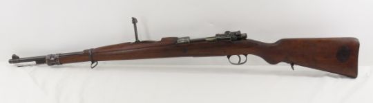 FN 24 Gew 98 Mauser Pattern Rifle 7x57mm - SN# 26043", no import marks, overall fair-good. Receiver top marked: FN, left marked: "FAB NAT ARMES DE GUERRE HERSTAL BELGIQUE", right side marked "26043". Straight bolt marked "R 306", cocking piece"27447". 19.8" barrel, front blade sight, rear tangent sight. Front band marked "721", cleaning rod, sling mounts. Wood stock marked: near front of trigger guard "2 (and possibly 1/2)", and a cartouche near steelbutt plate is most likely Chinese. This was very greased up- we did not disassemble to clean. 43.3" OAL C&R or FFL transfer required please know local laws before bidding. Please ask questions & read terms conditions before bidding.