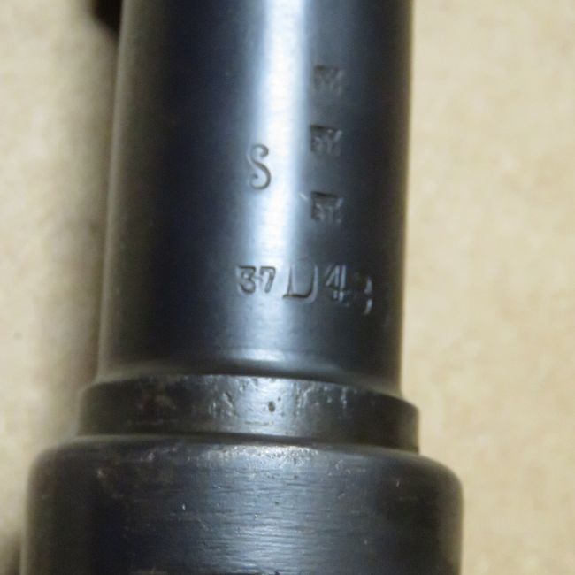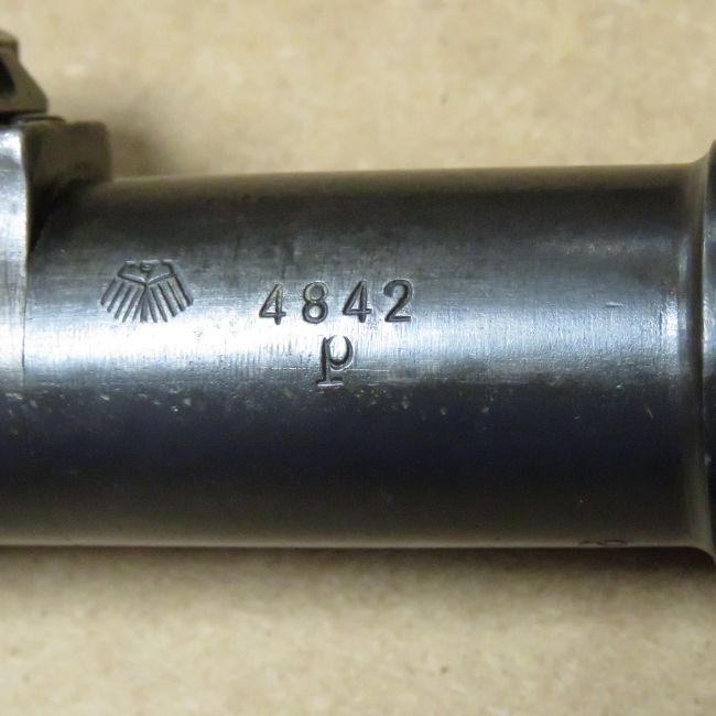 1937 JP Sauer S/147 Mauser K98k Rifle 7.92x57mm - SN# 4842p -all visible match except 1 screw, no import mark, good overall. Receiver top marked "S/147 1937 (J.P. Sauer & Sohn, Suhl )", left side marked "eagle 4842/p" Mod. 98", right side marked "eagle/swastika/359" and 2 "eagle/214". Bolt stop marked "eagle/214 42", cocking piece, safety & striker housing marked "eagle/214 4842", bolt handle marked "4842 p". 23.62" barrel left marked "eagle 4842 p", and ring marked "7,9". Rear v-notch tangent sight to 2,000 meters right side marked with 3 "eagle/359", base marked with 2 "eagle/359" and "4842", leaf marked with 2 "eagle/359", "4842", slide marked "eagle/359 842". Front blade sight base marked"eagle/214", cleaning rod, bayonet lug marked eagle 214 42". Front & lower bands marked "4842 eagle/214". Trigger guard marked with 2 "eagle/214" and 4841, and floor plate marked "eagle/214 4842", one screw marked""42" and other "56". Bolt disassembly disc marked "eagle/214" and other "O14217". Recoil lug marked "eagle/214". Wood stock has dings all over, marked near butt with 2 eagles and "H". ** Duffle cut- more pictures added. Stock & hand guard serial match the rest. Metal butt plate. Worn leather crosshatched sling. OAL 43.3" C&R or FFL transfer required, please know local laws before bidding. Please ask questions & read terms conditions before bidding.