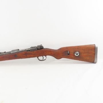 1943 Borsigwalde ar Mauser K98k Rifle 7.92x57mm - SN# 2058d, No visible import marks. overall fair- good, Waffenamt. Receiver top marked "eagle/swastika/26 ar 43" (Mauser-Werke, Berlin-Borsigwalde), left marked "eagle/swastika 2058 d Mod 98", Bolt handle marked "5256 e", striker housing & safety "0432", cocking piece "4346". 23.62" barrel (some pitting) top marked "eagle/26", left marked "eagle/swastika ?W". Front blade sight, no cleaning rod, bayonet lug "1".Front band marked "553i", lower band marked "3909". Trigger guard marked with 2 eagle/WaA63" and "3655", floor plate marked "eagle/214 8839". Sanded red glue laminate stock marked "BK inside circle" and "4315"near butt, cupped steel butt plate. OAL 43.3". C&R or FFL transfer required, please know local laws before bidding. Please ask questions & read terms conditions before bidding.