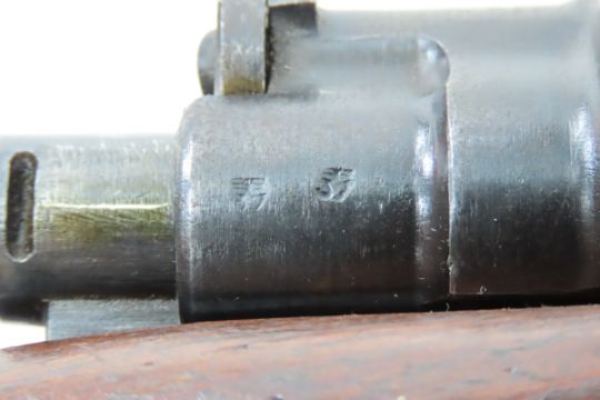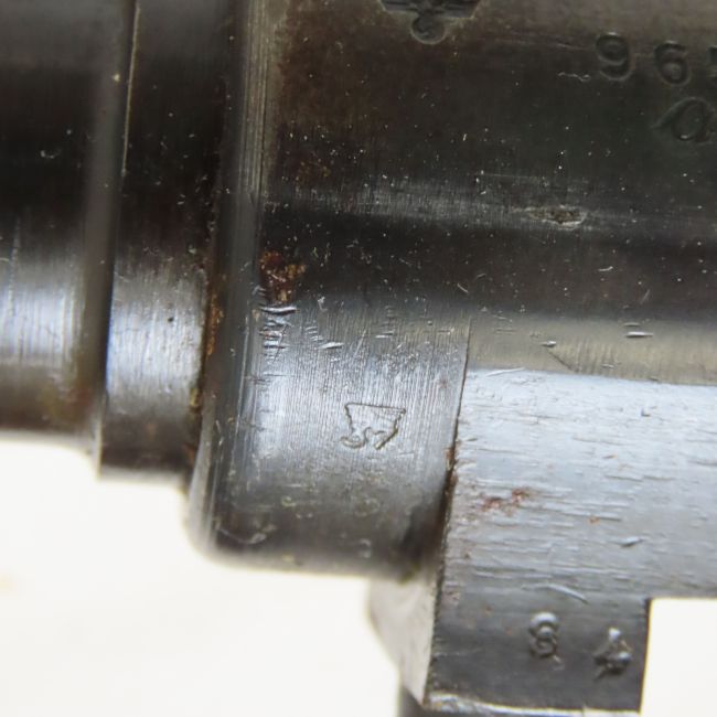 1941 JP Sauer ce Mauser K98k Rifle 7.92x57mm - SN# 9651a- all match, no import marks, overall good, Waffenamt. Receiver top marked "ce 41" (J.P. Sauer u. Sohn, Waffenfabrik, Suhl, Thuringia), left side marked "eagle/swastika 9651 a", right side has "eagle/359" and 2 "eagle/37". 23.62" barrel ring marked "7,9", left side marked "eagle/swastika 9651 a", right side marked is mostly covered by stock, and 2 "eagle/359". Front hooded sight mount marked "eagle/37".Bayonet lug marked "eagle/37 51", cleaning rod. Rear tangent sight base marked "9651", leaf "9651 eagle/359", slide "9651 eagle/3590". Bolt handle marked "9651 a", striker housing,cocking piece, & safety"9651, bolt stop marked "a 51". Front & lower bands marked "9651 eagle/37". Trigger guard marked with 2 "eagle/37" and "9651", floor plate marked "eagle/37 9651". Recoil lug marked "eagle/37". Red glue laminate stock wrist marked "eagle/swastika/WaA37", "9651 a eagle/swastika/WaA37 (other eagle mark)" underside near butt, right side butt marked "eagle/swastika H" and 2 "eagle/swastika/WaA37". Steel butt plate marked "eagle/37 9651 a". Stock & handguard marked 9651- all match - more photos added. 43.3" OAL C&R or FFL transfer required please know local laws before bidding. Please ask questions & read terms conditions before bidding.