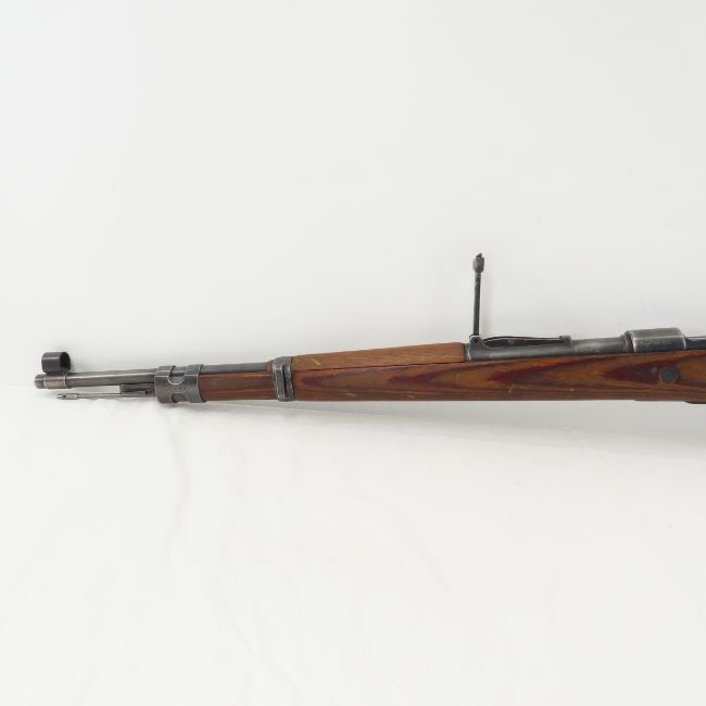 1942 bcd/ar Dual Code Mauser K98k Rifle 7.92x57mm - SN#6226 C, import "FED ORD INC SEM CA". Waffenamt. Overall good. Receiver top marked "eagle/swastika/? bcd/ar (Wilhelm-Gustloff-Werke, Weimar / Mauser-Werke AG, Berlin) / Iraqi proof / 42", left side marked "eagle/swastika 6226 C Mod. 98". 23.62" barrel top marked with Iraqi proof, left marked "6226", right marked "24G1". Rear tangent v notch sight to 2,000 meters marked on base "eagle/121", leaf"eagle/121 375". Front hooded blade sight, cleaning rod. Front band marked "1371 eagle/280", lower band marked "9122". Floor plate marked "eagle/WaA77 2950". Bolt marked "1333 V", striker housing, safety & cockingpiece marked7704. Red glue laminate stock with deep gouge on underside near butt. Cupped steel butt plate with hole.43.3" OAL. C&R or FFL transfer required, please know local laws before bidding. Please ask questions & read terms conditions before bidding.