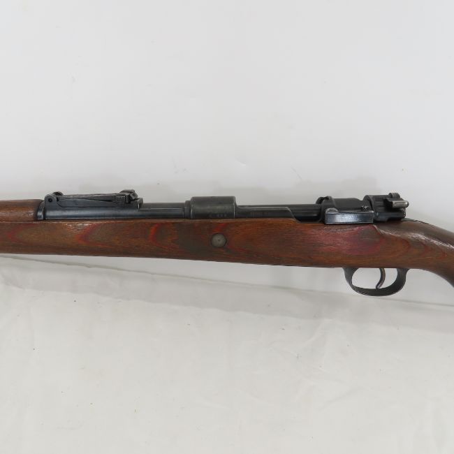1933 Oberndorf S/42K Mauser K98k Rifle 7.92x57mm - SN#489 no import marks, overall good, Waffenamt. Receiver top marked "S/42K", left "eagle 489 MOD. 98", right "S91 ? P74 ". 23.62" barrel marked left "eagle/swastika", Right "Geco"(Gustav Genschow & Co, Germany),ring "7,92" Hooded front blade sight "eagle/77", rear tangent sight marked with 3 "eagle/214", base marked "K P74 69", spring "eagle/359", leaf has 2 eagles and "5689". Bayonet lug "eagle/26 44", cleaning rod.Front & lower bands "489 P74", recoil lug "eagle/26". Bolt, striker housing, cocking piece & safety marked "489". Bolt stop marked "P74 89". Trigger guard has 2 "P74" and "489", floor plate has worn eagle and "489",screws marked "89". Bolt disassembly discs marked "O.31326". Naval mark, and other "eagle/26". Red glue laminate stock has several illegible eagle marks, butt plate marked "eagle/26 3444". Leather sling. 43.5"OAL C&R or FFL transfer required please know local laws before bidding. Please ask questions & read terms conditions before bidding.