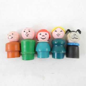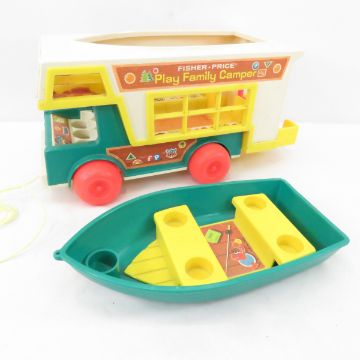 Fisher Price #915 Farm & #994 Camper & More-Farm Set: People Have Wood Bodies/Heads and Plastic Hair/Hats, Set is Mostly Complete - Additional Farm Pieces: There are 2 People, 1 has Wood Body/Head and Plastic Hat, 1 is all Plastic - Camper: People have WoodBodies/Plastic Heads/Hair, Dog has Wood Body/Head, One Chair has a Broken Arm, Grill has Broken Leg, Several Pieces have Initials written in ink on underside - Both sets look mostly complete but may be missing piecesPlease ask questions and read terms & conditions before bidding.