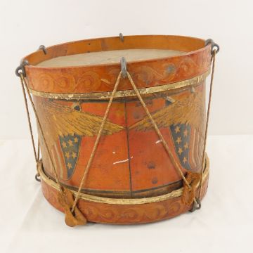 Vintage American Eagle Flag Drum-9" Diameter, Comes with 2 Sets Drum Sticks. Main band with the eagle is metal, strap that hold head are wood and head is most likely hide/skin of some sort. Please ask questions and read terms & conditions before bidding.