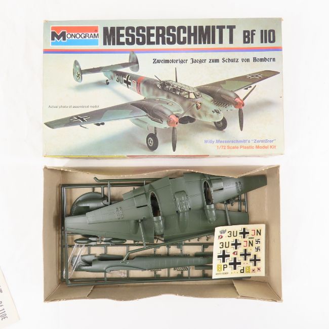 7 Vintage German Military Models in Boxes-Monogram, Revell, Aurora - Messerschmidt Bf109F Plane, Tiger Tank, Messerschmidt Bf 110 Plane, Blucher Cruiser Ship, Wolfpack U Boat, Heinkel HE100 Plane -- ALL open Boxes - Possible Missing PiecesPlease ask questions and read terms & conditions before bidding.