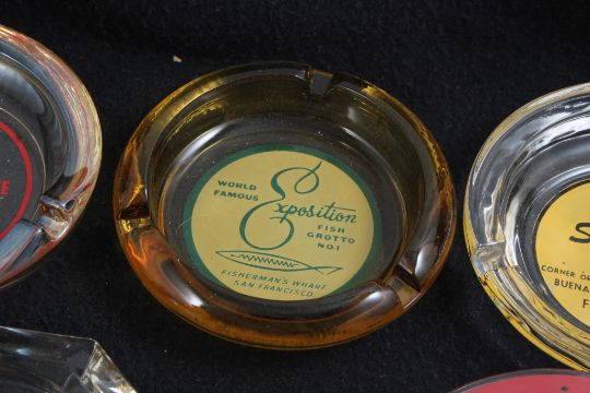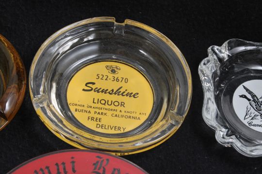 17 Vintage Glass Advertising Ashtrays - Advertising includes: Gulf Oil, Restaurants, Motels, Fisherman's Wharf Grotto, 1953 Silver Anniversary Gaines, Locker Plant, Motels, 1960 Alumni Reunion Muhlenberg College, Canvasback Duck, As pictured. Please ask questions and read terms & conditions before bidding.