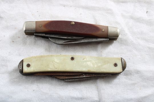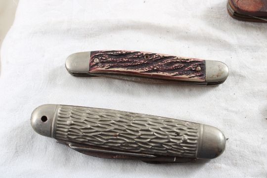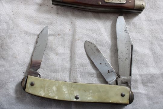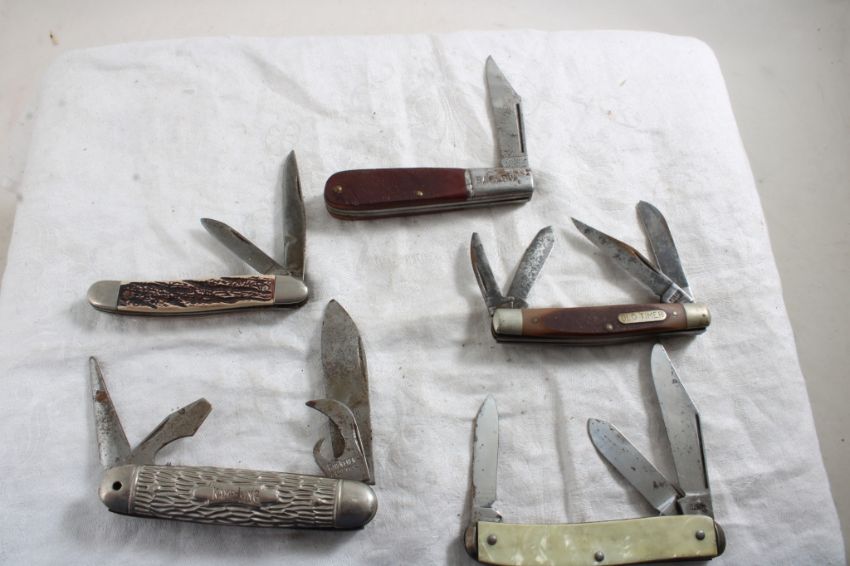 5 Pocket Knives USA, Schrade, Colonial, Camillus - Imperial. Schrade is a 3 blade Old Timer, Camillus has one broken blade. All as pictured. Please ask questions and read terms & conditions before bidding.