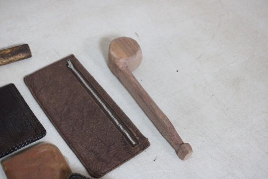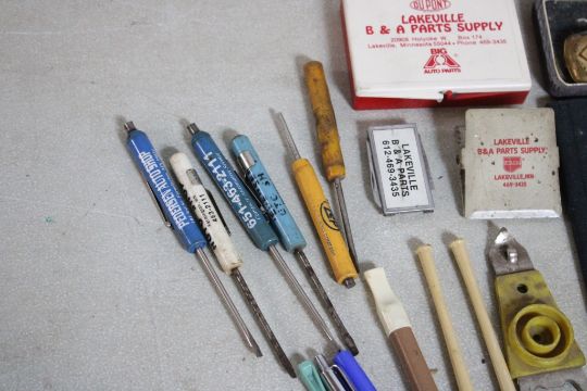 Junk Drawer Lot in Wooden Box 13"x 9.5" x 4" - Pocket Knife, Fillet Knife, Advertising Invoice Clip & Twins Bat Pens, Cigar Figural Pen, 76 Gas & Oil Orange Antenna Topper, Old Leather Wallets, Coin Purse, Key Holder, Notebook holder, 1934 Commencement PilgrimBooklet, Draftsman Instruments Kit, & More as pictured. Please ask questions and read terms & conditions before bidding.