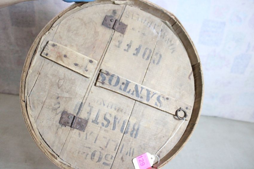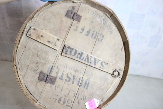 Antique 50lb General Store Roasted Coffee Barrel - Williams Roasted Ground Coffee General Store 50 pound wooden barrel. Measures 22" Tall x 16" in diameter. As pictured. Please ask questions and read terms & conditions before bidding.