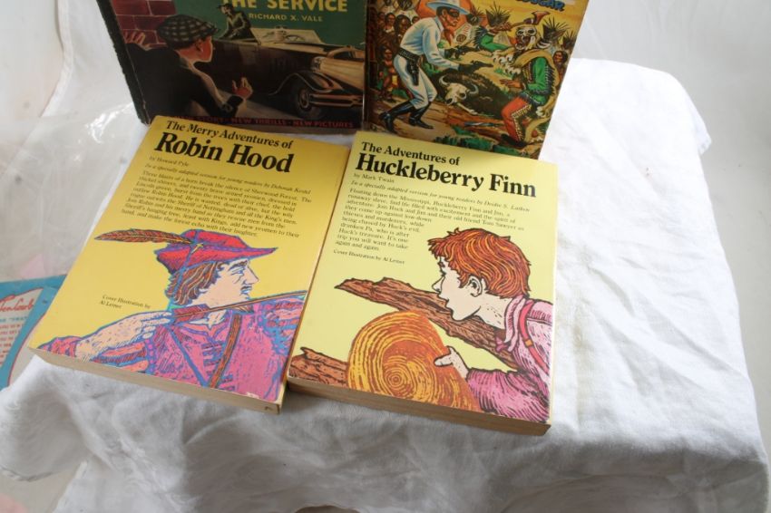 8 Children's Books - Lone Ranger Big Little Book, Tom Beatty Ace of the Service, 4 Ben Bolt & Joe Adams 1949 Western Books, 2 Moby Books 1979 Huckleberry Finn & Robin Hood. All as pictured. Please ask questions and read terms & conditions before bidding.