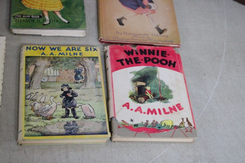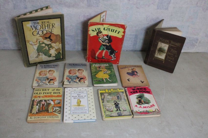 11 Collectible Hard Cover Children's Books - A. A. Milne WINNIE THE POOH, NOW WE ARE SIX, THE POOH BOOK OF QUOTATIONS, POLLYANNA, (2) THE BOBBSEY TWINS, 1916 THE REAL MOTHER GOOSE, 1886 MASTER THOUGHTS POEM, PROSE & PENCIL, 1947 Sir Gruff Fuzzy Wuzzy Book, TheSecret of the Old Post Box. All as pictured. Please ask questions and read terms & conditions before bidding.