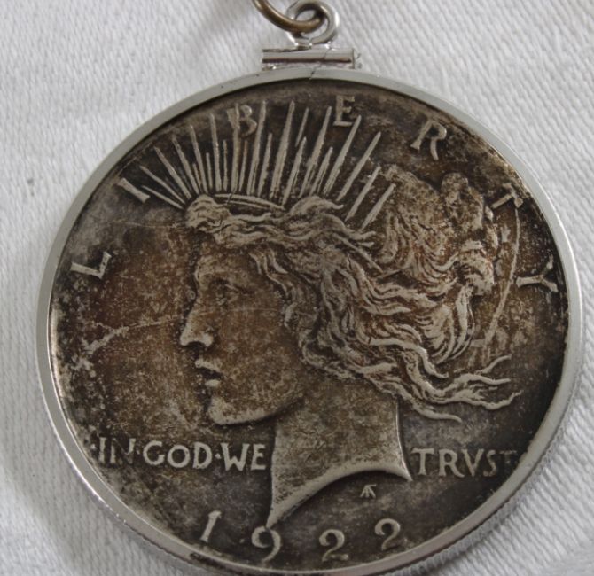 1922 D Peace Silver Dollar w/Sterling Silver Chain - As pictured. Please ask questions and read terms & conditions before bidding.