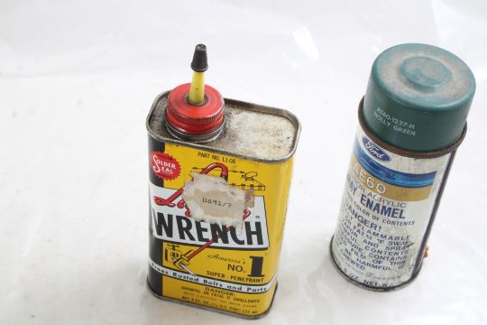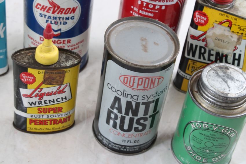 Advertising Cans, Jars, & Oilers - Chevron Starting Fluid, Nitro Marine Engines, Lan-Lin Hand Cleaner, Devolube Oil Improver, Ford AE60 Exterior Spray Enamel Nor-V-Gen Shoe Oil, Phillips 66 Stop Leak, Dupont Anti-Rust, Liquid Wrench (2). Aspictured. Please ask questions and read terms & conditions before bidding.