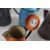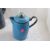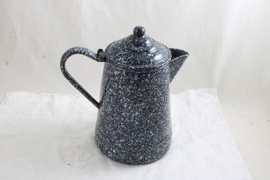4 Enamelware Coffee Pots - Orange 9" Tall, Brown Sponge Ware 10" Tall, Blue 10 1/2" has a Pyrex glass top, Navy Spatter Ware 11" Tall. As pictured. Please ask questions and read terms & conditions before bidding.