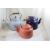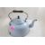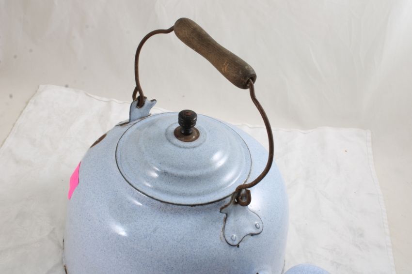 3 Enamelware Wood Bale Handled Tea Kettles - All are around 8" to 9" Tall not counting the handles. Pink, Light Blue Speckles and Dark Blue Speckles. All as pictured. Please ask questions and read terms & conditions before bidding.