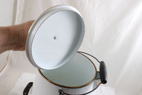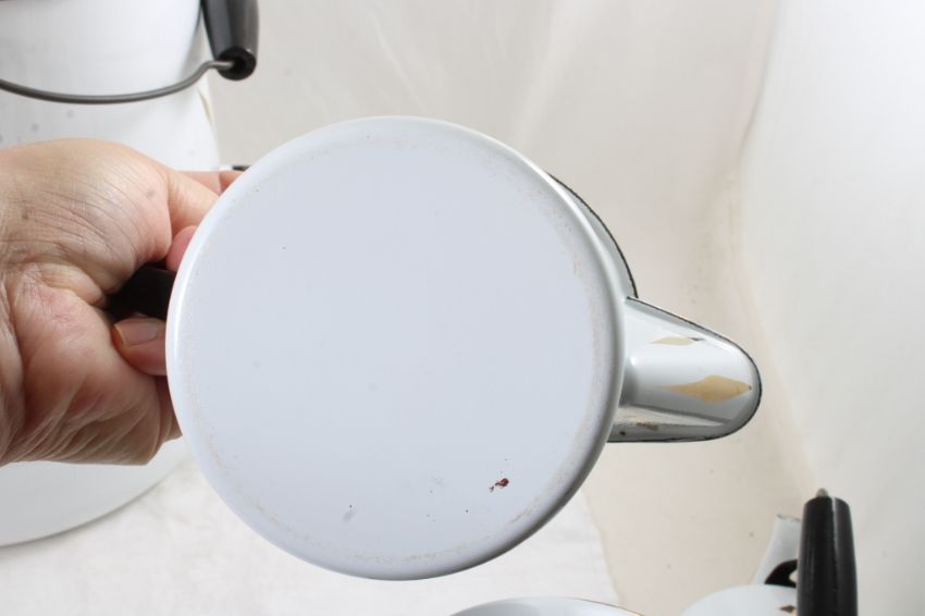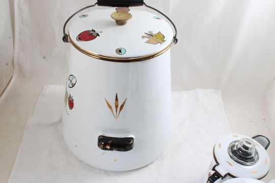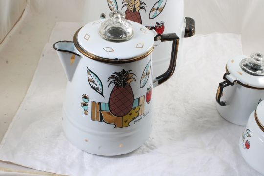 4 Georges Briard Enamelware Coffee & Teapots - Georges Briard Ambrosia Pattern: One Cowboy Campfire Coffee Pot 13" Tall, Teapot 5 1/2" Tall, Coffee Pot 6" Tall & Coffee Pot 11" Tall. All as pictured. Please ask questions and read terms & conditions before bidding.