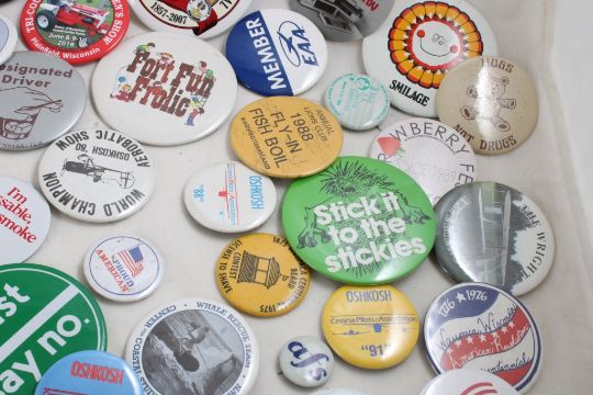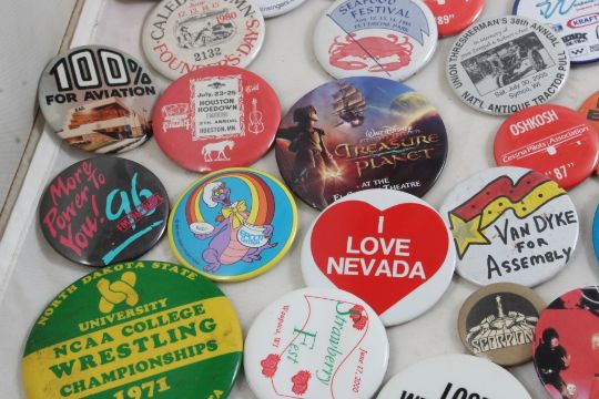 Half Gallon Jar Full of Collectible Pinbacks - Many advertising pinbacks including: Judas Priest, Motley Crue, 1982 Epcot Disney, and so many others. All as pictured. Please ask questions and read terms & conditions before bidding.