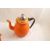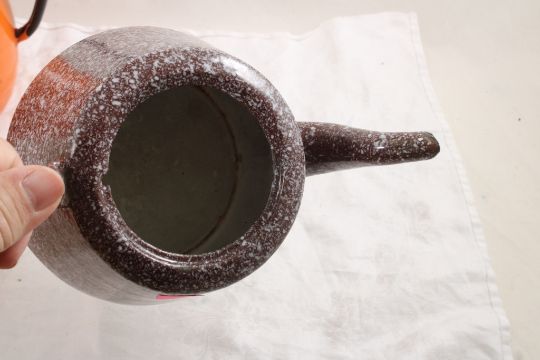 4 Enamelware Teapots - Yellow 6" Tall, Orange 6" Tall, Brown Speckle 5 1/2" Tall and Orange 9" Tall as pictured. Please ask questions and read terms & conditions before bidding.