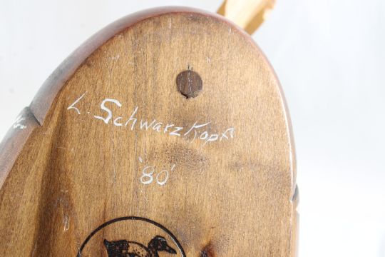 1980 Wooden Signed Mallard Duck Decoy - Glass Eyes. Artist Signed Mallard Drake Duck Decoy measuring 15" Long. Has a chip under the bill, as pictured. Please ask questions and read terms & conditions before bidding.