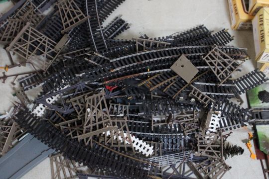 Life Like HO Scale Railroad Cars, Buildings, Track - Train Cars & Locomotives are in boxes. Buildings, Track and Everything else pictured is included as well. Please ask questions and read terms & conditions before bidding.
