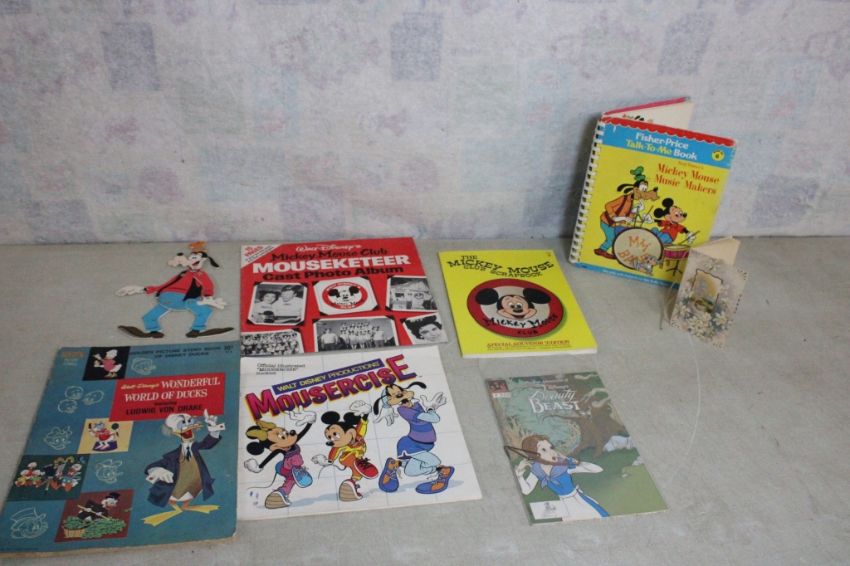 Walt Disney Vintage Items - Disney's Beauty & The Beast Comic Book #2, 1976 Disney Mouseketeer Cast Photo Album, Mousercise Booklet, #1501 Disney Goofy Jointed Figure Durham Industries 10.5" Tall, 1976 Mickey Mouse Club Scrapbook, FisherPrice Talk To Me Mickey Mouse Music Makers Book Record. All as pictured. Please ask questions and read terms & conditions before bidding.