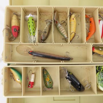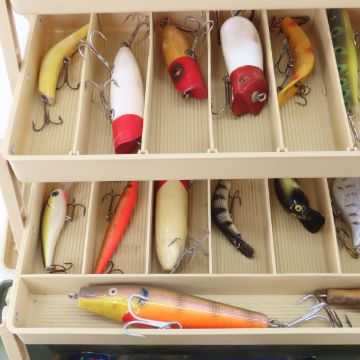 Plano 8606 Tackle Box Full of 40+ Lures - Creek Chubb Pikie Minnow in box, Daredevle & Norman in packages, Luht Jensen Woodchopper, Arbogast Jitterbug, Flex-Ike, Cisco-Kid and others. American Legend fish knife in sheath. Please ask questions and read terms & conditions before bidding.
