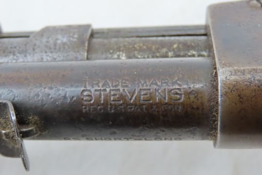 J Stevens No 70 Visible Loading Repeater .22S,L,LR - patent date 07, slide action, 22" barrel (exterior pitting), front blade sight (replaced), rear leaf sight, tube feed- missing tube, ribbed wood slide handle , straight wood stock, SN# G543, manufacturedbetween 1907 and 1934, C&R or FFL transfer required, please know local laws before bidding. Please ask questions and read terms & conditions before bidding.