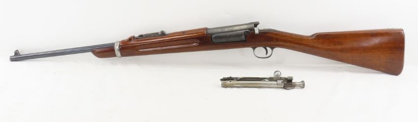 US Springfield Armory Mod 1899 Krag Carbine Rifle - SN#35290, No visible import marks. Had to use quite a bit of lube to get action to move- a good disassemble and cleaning should make it great again, bluing and wood are very good..30-40 krag, bolt action, Receiver marked "Model 1899 US Springfield Armory 352960". 22" barrel with blade front sight on a high stud, and rear ladder sight marked "C" (stuck). Knurled knob cocking piece, woodstock, single band marked "U", wood stock stamped "JSA " in box on left side near trigger. Steel curved toe butt plate with trapdoor compartment- empty. 41"OAL. C&R or FFL transfer required, please know local laws before bidding. Please ask questions and read terms & conditions before bidding.