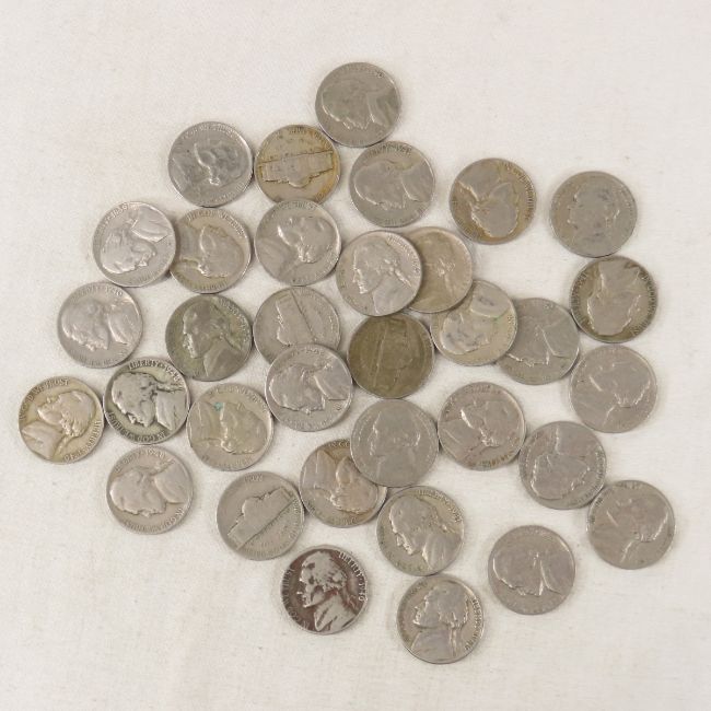 US Nickels; 11 Buffalo, 13 Liberty, 5 Silver War - plus 3 rolls vintage JeffersonPlease ask questions & read terms and conditions before bidding.