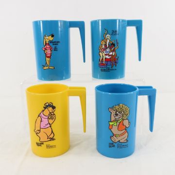 1971 Plastic Character Mugs & More - 5 1971 Hanna-Barbera mugs, 5 Walt Disney mugs, 1 Kellogg's bowl, TNMT cup, Donald Duck tumbler in package, Simpsons mug, and smiley mg Please ask questions and read terms & conditions before bidding.