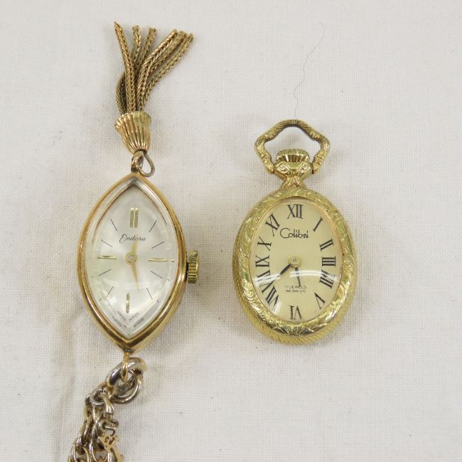 Vintage Pocket Watch, Men's & Ladies Wrist Watches - 1) Westclox Pocket Ben not working- crown falls out, 2) Ingraham box, 3) Addison pocket watch- cracked crystal, missing back, seems to work 4) ladies watch pin with 4 watches- Elgin, Okay, Lotus 7 jewel missing crystal,and Lady Penn 15 jewel (none are working) 5) working wind watches: Timex girl scout, Westclox 17 jewel, Bulova 17 jewel, Bulova 21 jewel, Colibri pendant, Endura pendant on chain. 6) Not working wind: Gruen, 2 Timex7) Quartz wristwatches- need batteries: Sharp, Sarah Coventry, 8) antique pin, stick pin & vintage retractable chain pin in vintage jewelry box- no key Please ask questions and read terms & conditions before bidding.