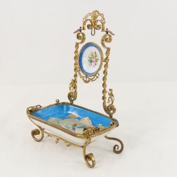 1850's French HB & Cie Chatelaine Watch Stand - marked : "Porcelaine Choisy-le-roi Hippolyte Boulenger" Provenance, France 1837-1874 (H B & Cie), ormolu gilt metal stand with hand painted hummingbird floral theme porcelain. minor damage on edges of dish, 1 corer hasglue. 8 3/4 x 5 3/4 x 3 1/2" Please ask questions and read terms & conditions before bidding.
