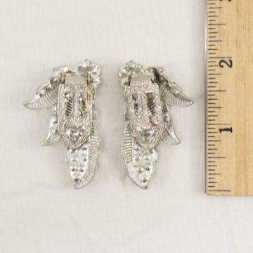 2 Single & 1 Set of Vintage Rhinestone Dress Clips - Possible rhodium plated Eisenberg with clear stones 1 3/4" in excellent condition, 2 1/8" wide has loose clip and some discoloration, and matching pair has leaf motif Please ask questions and read terms & conditions before bidding.