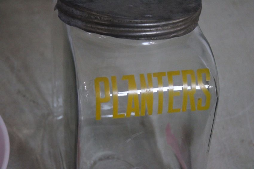 Planters Peanuts Streamline Countertop Display Jar - Lid has damage and is not the original lid. Plus Pyrex Red Mixing Bowl #402. As pictured. Please ask questions & read terms and conditions before bidding.